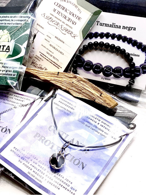 El Pack Definitiu de Protecció Extrema 🛡️✨: blindatge total contra tot malament. Material: plata de llei. Grandària MOLDAVITA mitjana: 2-3 cm. Pedra 100% natural certificada i en contacte amb la pell. Pal sant de regal per netejar els teus amulets.