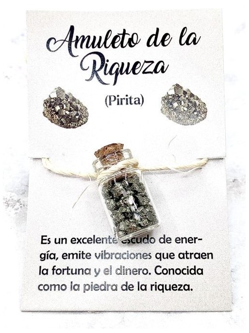 Aquest mineral és la pedra de l'abundància i la pau. També, és un excel·lent escut d'energia, bloqueja i talla el pas de lenergia negativa en tots els àmbits. Estimula l'ambició, la perseverança i el compromís. Atrau la riquesa, els diners, la prosperitat i l'abundància, per això és molt recomanable col·locar una Pirita a prop de la caixa registradora del nostre negoci o dins de la nostra bossa. Es recomana tenir-la en múltiples de tres.