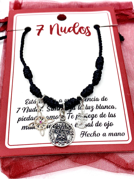 Una polsera de triple protecció és una peça de joieria dissenyada per proporcionar múltiples capes de protecció espiritual, emocional i física. Aquestes polseres solen combinar tres amulets diferents, cadascun conegut per les seves propietats protectores. Aquesta polsera uneix el Nus de Bruixa amb la Creu de Caravaca i lel Tetragramató.