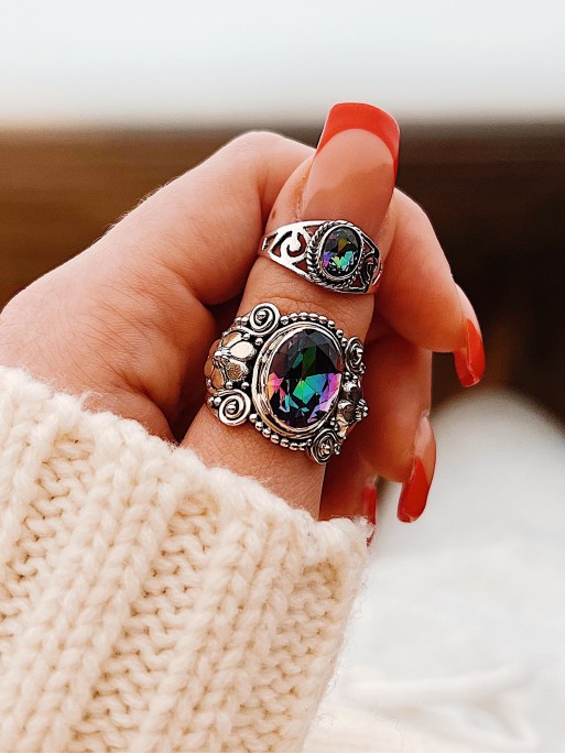 El topazi místic és una gema captivadora, nascuda de l’alquímia entre el topazi natural i un tractament especial que li dona una lluentor irisada—com un arc de Sant Martí atrapat dins del cristall. Els seus reflexos semblen desvetllar els secrets de l’univers i la llum interior de l’ànima.