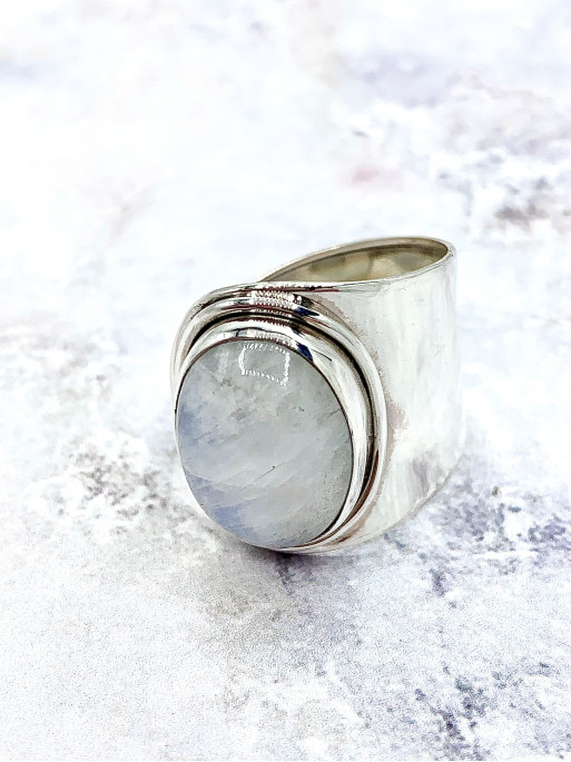 L'anell Irina és un anell ètnic molt cridaner i original. Està elaborat de Plata de Llei 925 i el seu disseny és ajustable, de manera que el pots combinar en diferents dits. Consta d'una preciosa Pedra lluna de mida gran, envoltada d'una base de plata. Té un color natural preciós amb centelleigs blaus. Sens dubte és un anell que atrau totes les mirades.