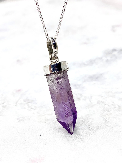 El collaret de punta d'Ametista és un collaret súper bonic. Està fet de Plata de Llei 925 i destaca el preciós color porpra de l'Ametista natural. El disseny està inspirat en les puntes de Quars natural, tallades i polides i decorades amb un fi i elegant disseny de plata. És un collaret amb un estil molt bonic i natural.