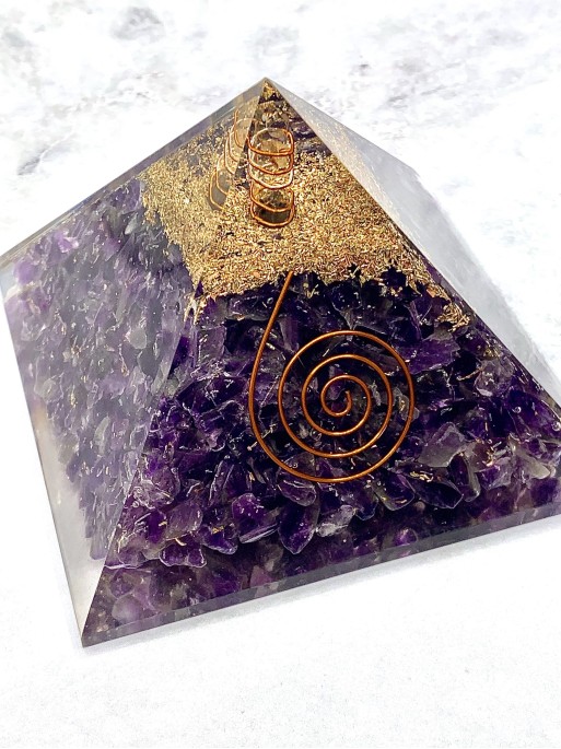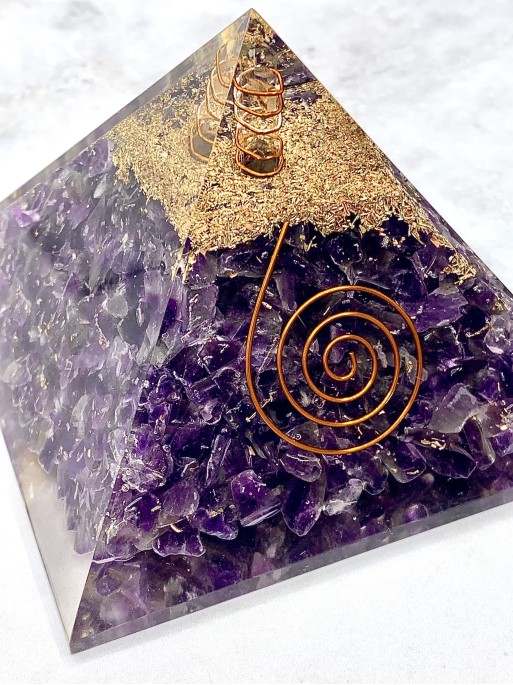 Les nostres piràmides d'Orgonita són un accessori esotèric súper exclusiu. Estan elaborades de resina, xips de Ametista, espiral de coure, encenalls de metall i una punta de Quars Blanc. Té una mida aproximada de 10 cm x 10 cm.