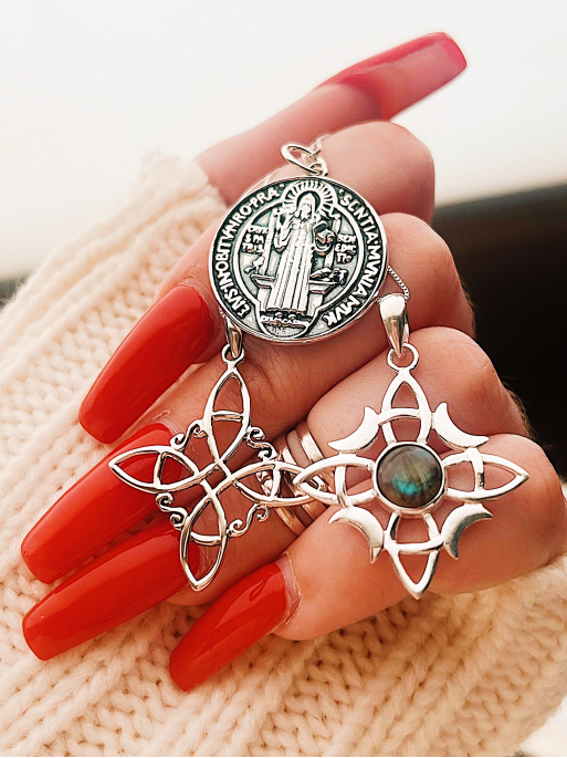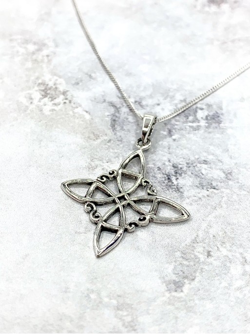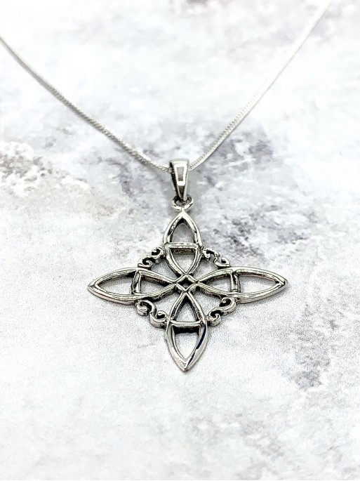 El nostre collaret de simbologia del famós Nus de Bruixes, està elaborat íntegrament a Plata de Llei 925. Té una mida ideal de 2,8 cm x 2 cm. És súper bonic i cridaner. Entre les nostres opcions, podràs escollir entre un cordó negre ajustable o una cadena fina i elegant de 40-45 cm de plata.