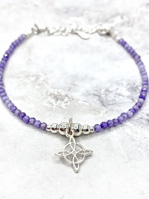 La nostra polsera de simbologia del famós Nus de Bruixes, està elaborada íntegrament a Plata de Llei 925 i envoltada de boletes d'Ametista, elaborada 100% a mà. Té una mida ideal, ajustable i còmode. És súper bonic i cridaner. Té un estil únic, pots ajustar-la i adaptar-la al teu canell d'una manera molt còmoda i senzilla.