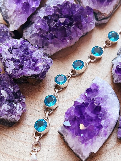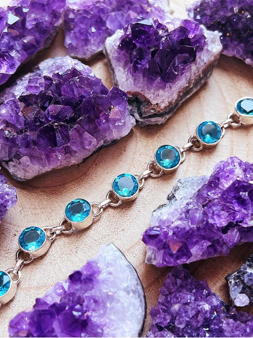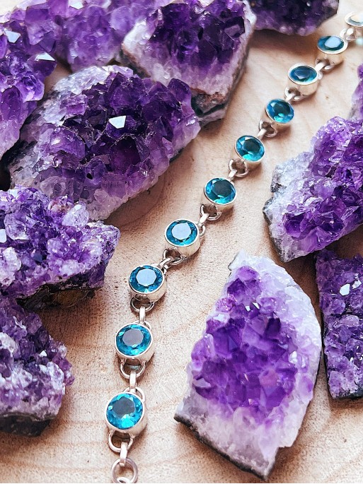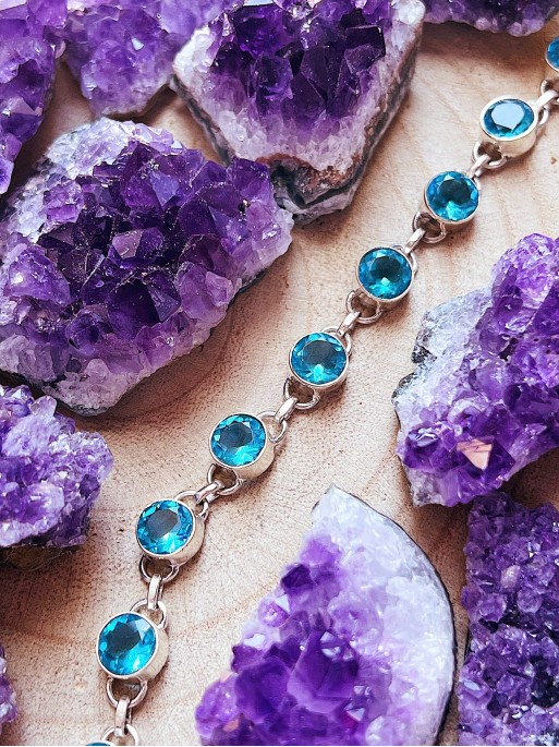 La polsera Monroe és una de les nostres polseres més impressionants i cridaneres. Està elaborada de Plata de Llei 925 i posseeix preciosos topazis blaus facetats. El topazi té un color blau intens increïble, és una polsera que deixa sense paraules a què la veu. Està elaborada meticulosament i amb una quantitat de plata superior, és una polsera amb pes i detall. El disseny és minimalista i elegant perquè destaquin les pedres precioses com a element principal.
