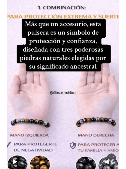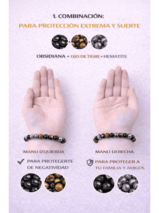 La unió d’Obsidiana Negra, Hematita i Ull de Tigre crea una sinergia de protecció, força i equilibri, ideal per a persones sensibles, empàtiques o que desitgen reforçar el seu camp energètic en el dia a dia.