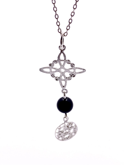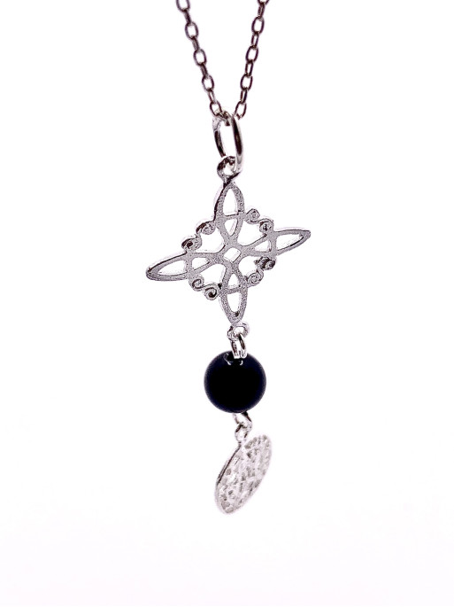 Collaret triple protecció de plata: Nus de Bruixa i Tetragramató. Mineral: Turmalina negra. Grandària: 3 cm. Material: plata de llei