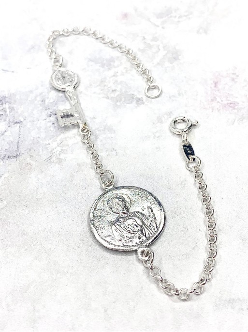 Polsera triple protecció de plata: Medalla clau de Sant Benet i Sant Judes Tadeu