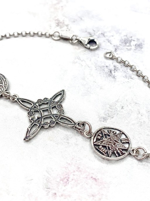 Triple protection silver anklet: Witches Knot, Tetragrammaton and Saint Benedict Medal