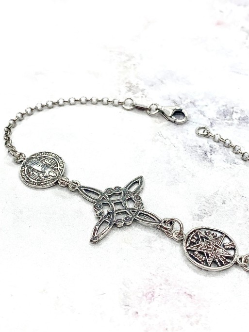 Triple protection silver anklet: Witches Knot, Tetragrammaton and Saint Benedict Medal. Material: sterling silver. Size: 20-26cm.