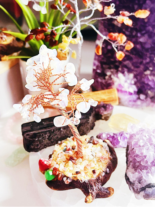 Moonstone, the central stone of this tree, is known as the crystal of feminine energy, intuition, and new beginnings. Its soft, nurturing vibration works directly with the heart chakra and sacral chakra, helping to balance emotions, heal emotional wounds, and attract true love from a place of calm, receptivity, and authenticity. It is ideal for sensitive and empathic people or for those who wish to build relationships rooted in emotional depth and mutual respect.