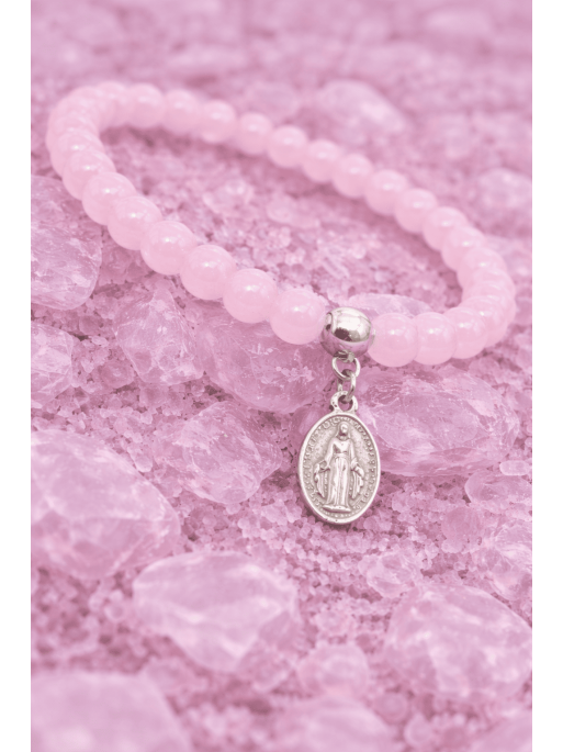 Wearing a rose quartz bracelet with the Miraculous Virgin medal keeps a symbol of love, spiritual protection, and positive energy close to you, helping attract well-being, harmony, and good fortune into your life.