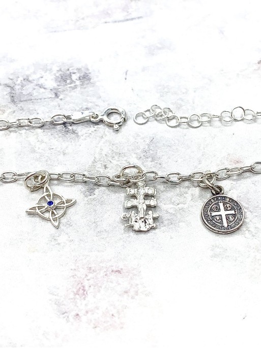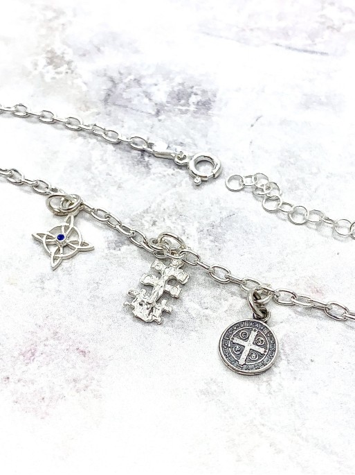 Triple protection silver anklet: Witch's Knot, Caravaca Cross and Medal of Saint Benedict. Material: sterling silver