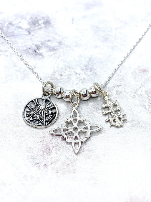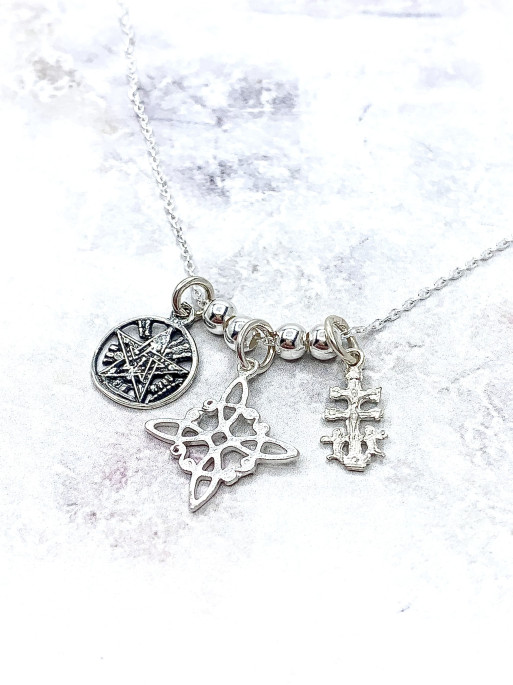 Triple protection silver necklace: Witch's Knot, Caravaca Cross and Tetragrammaton