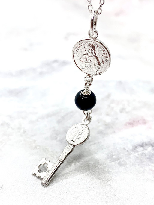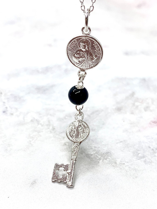 Triple protection silver necklace: Key to open the path, Medal of Saint Benedict, Saint Jude Thaddeus and Black Obsidian
