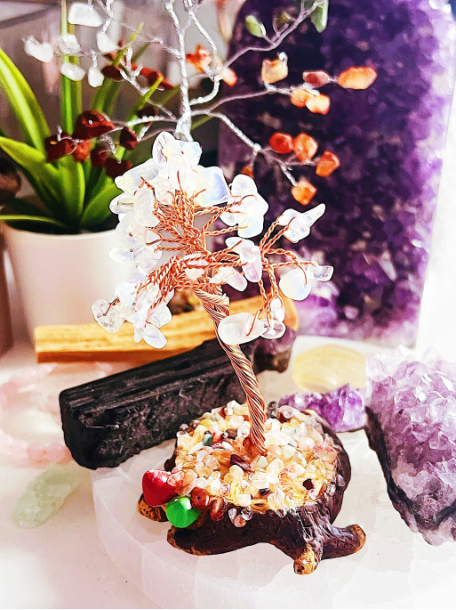La Piedra Luna, piedra central de este árbol, es conocida como el mineral de la energía femenina, la intuición y los nuevos comienzos. Su vibración suave y envolvente actúa directamente sobre el chakra del corazón y el chakra sacro, ayudando a equilibrar las emociones, sanar heridas afectivas y atraer el amor verdadero desde la calma, la receptividad y la autenticidad. Es ideal para personas sensibles, empáticas o que desean construir relaciones basadas en el respeto emocional y la conexión profunda.