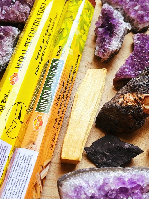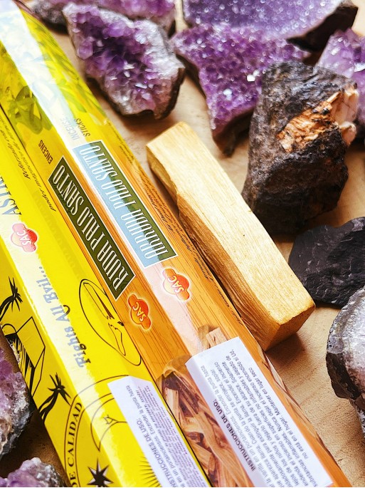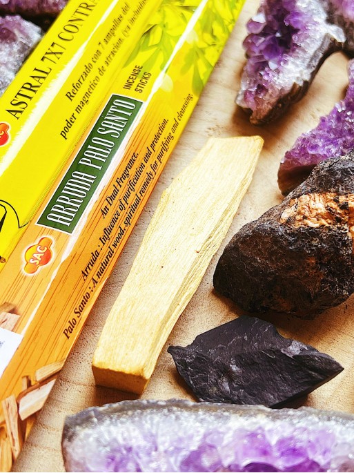 - Palo Santo: Se utiliza para purificar los ambientes y transmutar las energías. Repele las energías negativas, purifica los ambientes densos y cargados de malas vibras, y atrae las energías positivas. También, al tener tal poder de purificación limpia los minerales energéticos cargados de energías malas y densas. Purifica y elimina la energía negativa de las estancias. Culturalmente se suele utilizar para rituales espirituales, para atraer la buena suerte, alejar la negatividad, aliviar las enfermedades causadas por el estrés, así como para mantener la calma y el equilibrio emocional, elevar la autoestima y mejorar el humor.