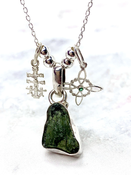 Este mineral natural se formó hace más de 15 millones de años por el impacto de un meteorito. Es un tipo de tectita, que destaca por su color verde oscuro, y que principalmente podemos encontrar en la región de Bohemia en la República Checa.