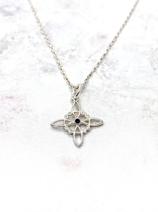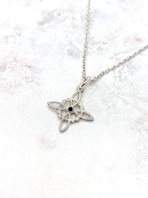 Nuestro collar de simbología del famoso Nudo de Brujas, está elaborado íntegramente en Plata de Ley 925. Tiene un tamaño ideal de 2,5 cm x 1,8 cm. Es súper bonito y llamativo. Entre nuestras opciones, podrás escoger entre un cordón negro ajustable, o una cadena fina y elegante de 40-45 cm de plata.