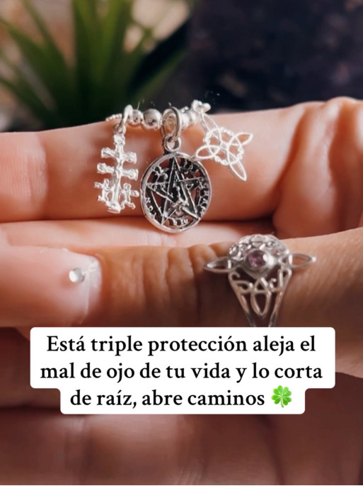 Collar triple protección de plata: Nudo de Bruja, Cruz de Caravaca y Tetragramatón. Material: plata de ley.