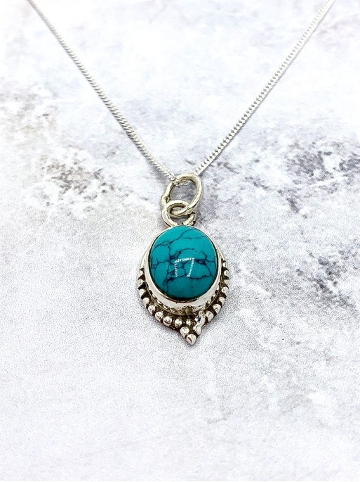 El collar Trishna es un collar muy bonito hecho a mano de Plata de Ley 925. Su diseño esta destaca la preciosa piedra natural en forma ovalada, rodeada de una base de bolitas de plata acabada en punta en la parte inferior. La Turquesa tiene un color azul con vetas oscuras precioso. Tiene un estilo étnico súper llamativo. Sin duda, es un collar que te enamorará!
