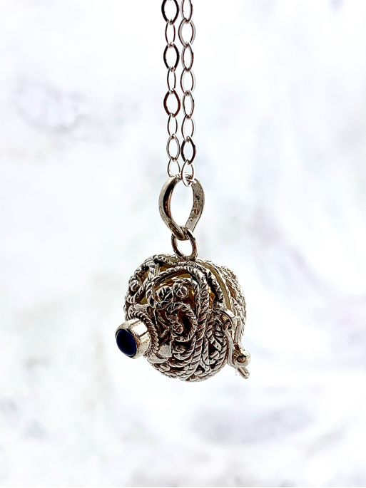 Nuestro llamador en forma de corazón está inspirado en los clásicos llamadores de Ángeles. Está elaborado en detalle y trabajado minuciosamente en Plata de Ley 925. Tiene un sistema de apertura lateral para poder abrirlo, intercambiar la bola interior, introducir papelitos, etc. Destaca la bonita piedra natural como centro del diseño. Tiene un estilo de filigrana de plata muy detallado, bonito y especial. Su campanita interior tiene un sonido muy angelical.