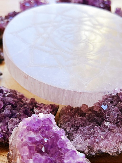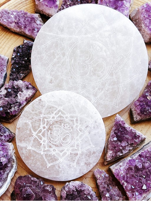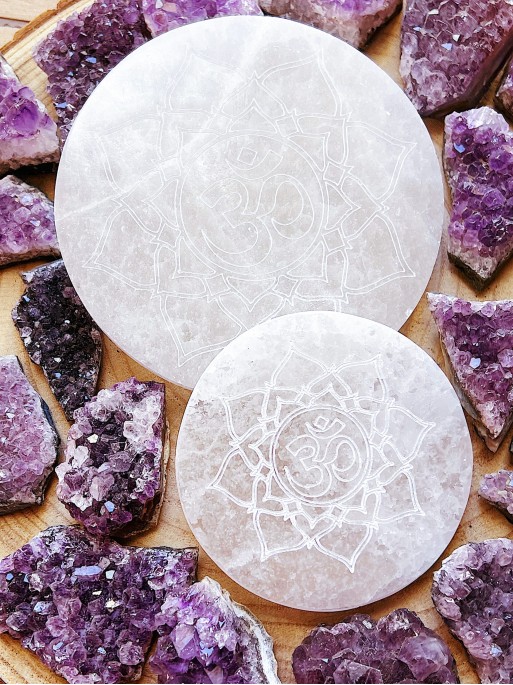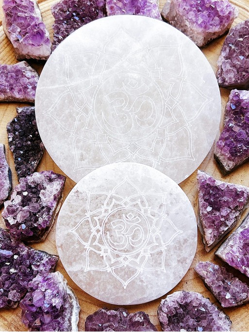 Esta placa de Selenita con el Om, te ayudará a limpiar tanto tus cristales como tus joyas, todas aquellas que tengan minerales (talismanes de protección también). Ella eliminará y limpiará de energías acumuladas en tus anillos, colgantes, pendientes… Sólo tienes que dejarlas por las noches encima de esta placa y ella hará el resto.