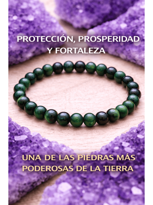 La pulsera está elaborada con bolas de 8 mm de Ojo de Tigre Verde natural, montadas sobre goma elástica de alta resistencia, perfecta para llevar a diario como amuleto de poder y protección continua.