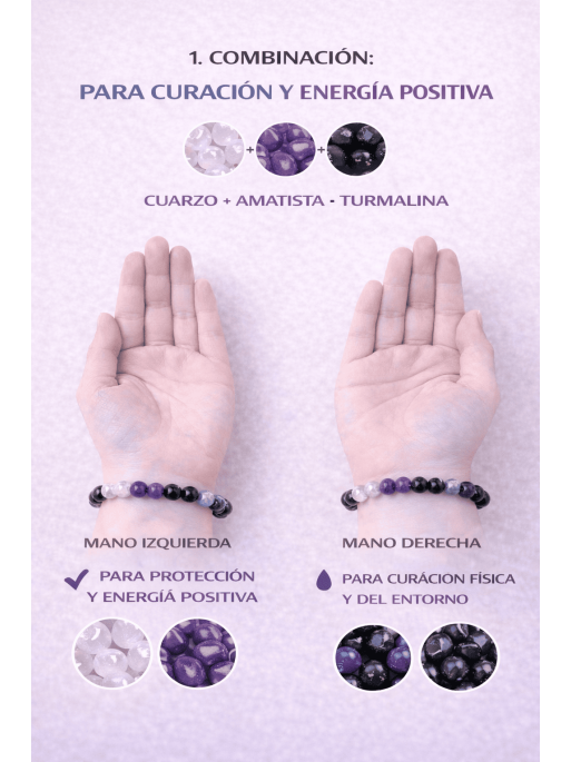 El ojo de tigre simboliza la fuerza, la seguridad y la prosperidad, siendo ideal para atraer abundancia, confianza y determinación. La amatista aporta calma mental, intuición y conexión espiritual, ayudando a equilibrar emociones y elevar la vibración personal.