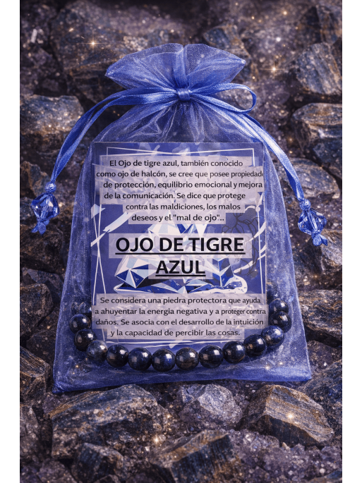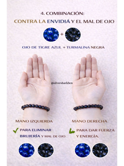 mientras la Turmalina absorbe y bloquea la energía negativa, el Ojo de Tigre Azul fortalece la mente, la voluntad y la confianza personal.