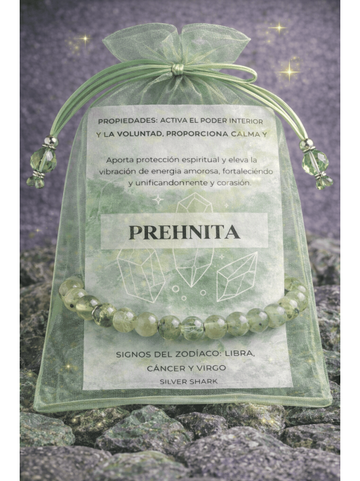 La Prehnita es conocida como la piedra de la serenidad y el amor incondicional. Se le atribuyen propiedades mágicas y espirituales que transforman la energía del entorno y del corazón: