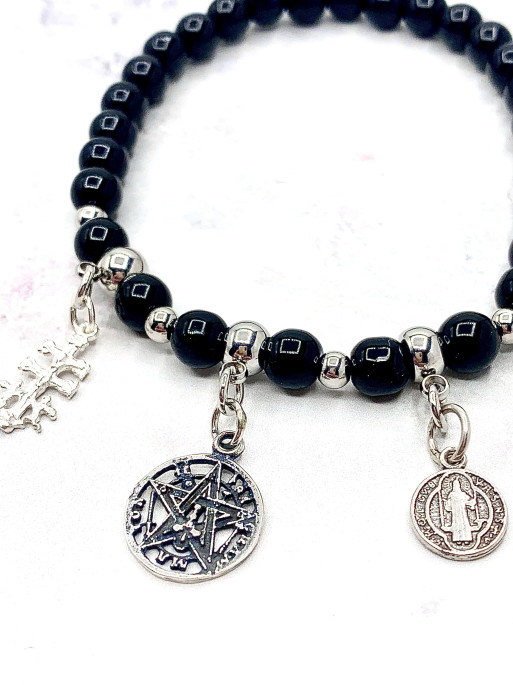 Pulsera de Obsidiana negra triple protección de plata: Tetragramatón, Cruz de Caravaca y San Benito. Material: plata de ley.