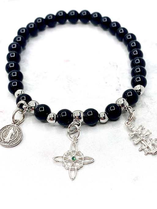 Pulsera triple protección de plata: Nudo de Bruja Esmeralda, Cruz de Caravaca y San Benito con Turmalina