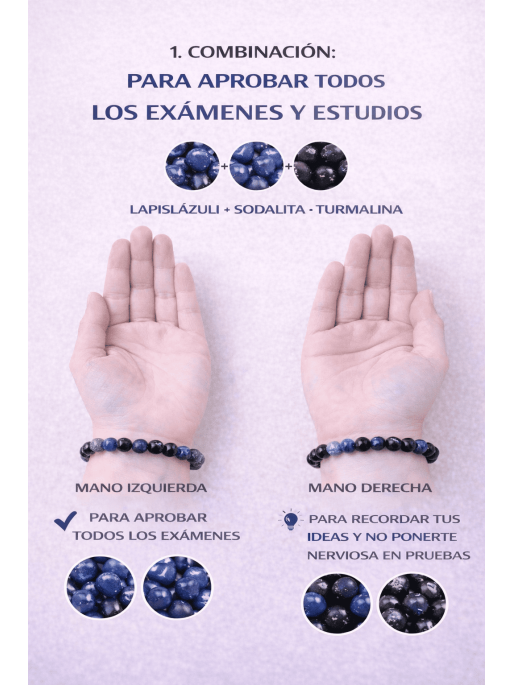 Esta combinación convierte a la pulsera en un auténtico portal de inteligencia, ideal para exámenes, estudios intensivos, trabajo intelectual o momentos que requieren concentración y claridad. Está montada en goma elástica resistente, cómoda y duradera, pensada para acompañarte a diario sin perder su energía ni su belleza.