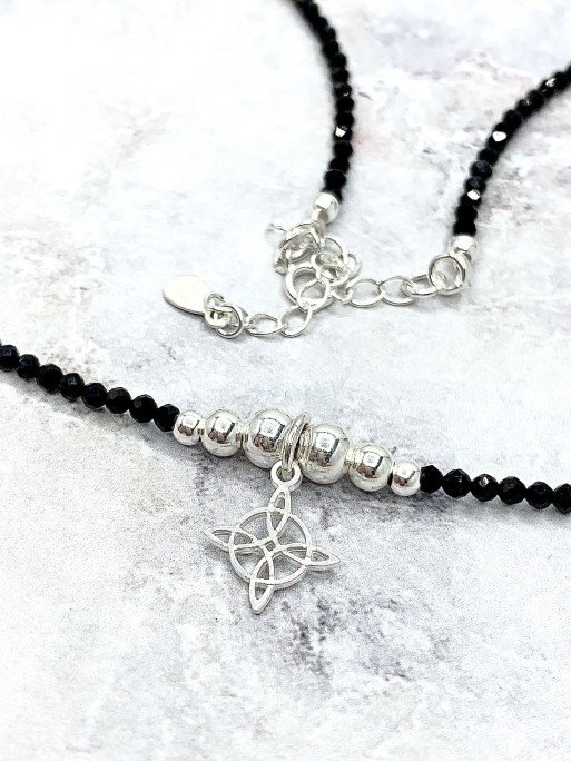 Nuestro collar de simbología del famoso Nudo de Brujas, está elaborada íntegramente en Plata de Ley 925 y rodeado de bolitas de Ónix negro, elaborado 100% a mano. Tiene un tamaño ideal, ajustable y cómodo. Es súper bonito y llamativo. Tiene un estilo único, puedes ajustarlo y adaptarlo como más te guste, más estilo choker o tipo collar, como prefieras.