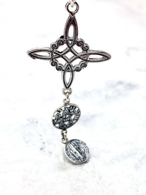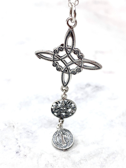 Collar triple protección de plata: Nudo de Bruja, Medalla de San Benito y Tetragramatón. Tamaño: 5 cm. Material: plata de ley.